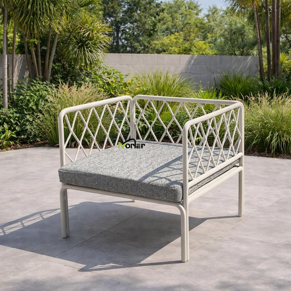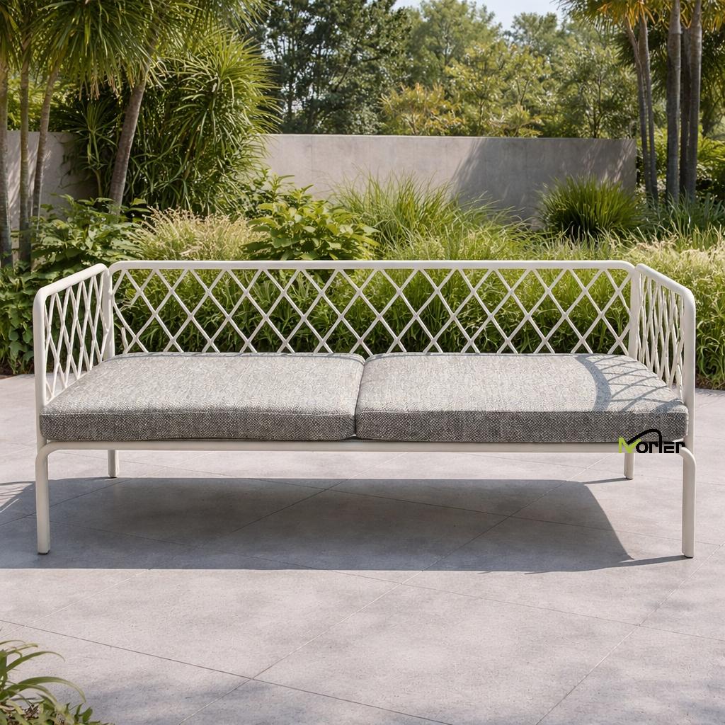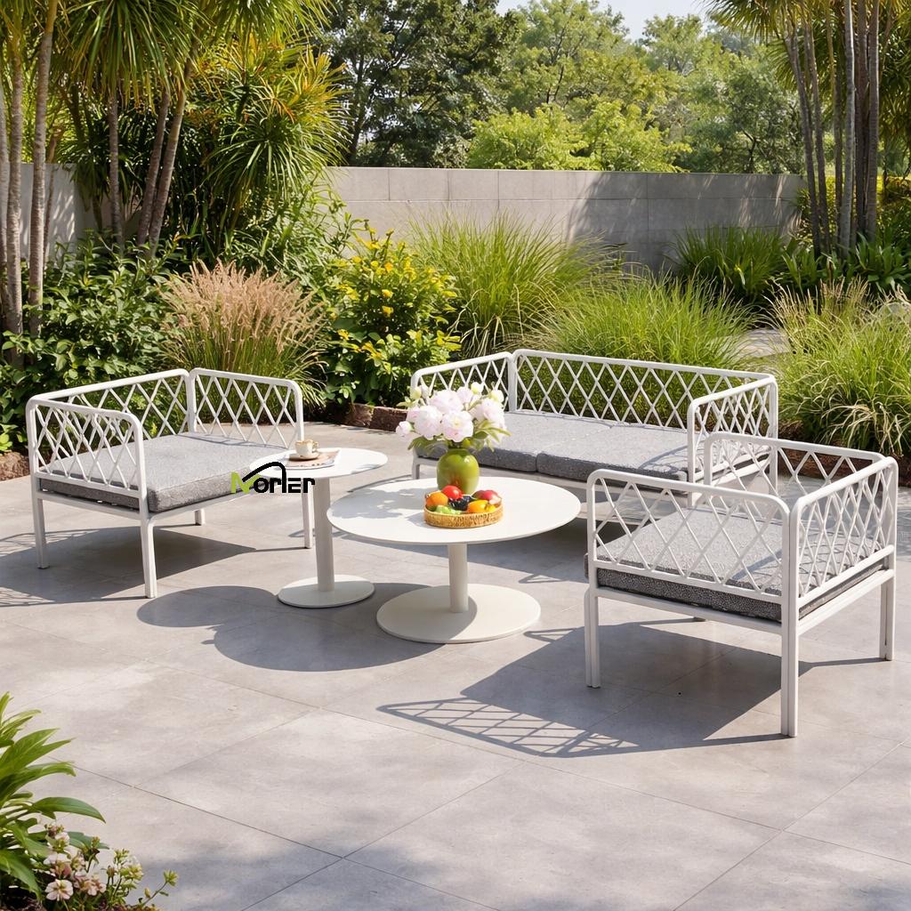 Acest set modern de canapele pentru exterior are un design curat și minimal, cu un cadru metalic geometric frumos lucrat. Structura cu zăbrele deschisă creează un aspect ușor și elegant, menținând în același timp un suport structural puternic.